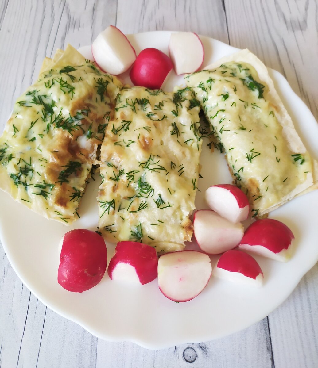 лаваш 40 гр, яйцо 58 гр, сыр 32 гр, масло 1 гр, редис 80 гр.