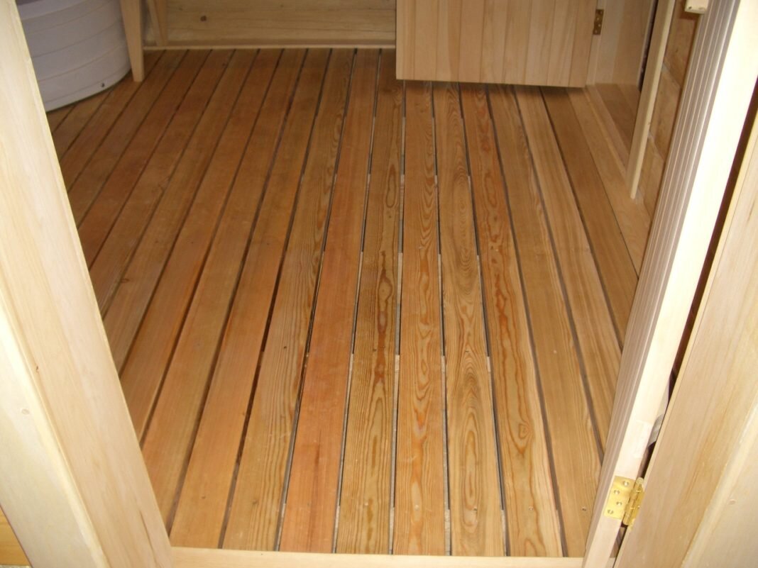 При укладки деревянного пола в моющем отделении бани необходимо оставлять компенсационные зазоры для того,чтобы доски не деформировались и не растрескивались.При сильных колебаниях температуры в бане древесина полов расширяется, поэтому и ВАЖНО оставлять зазоры.