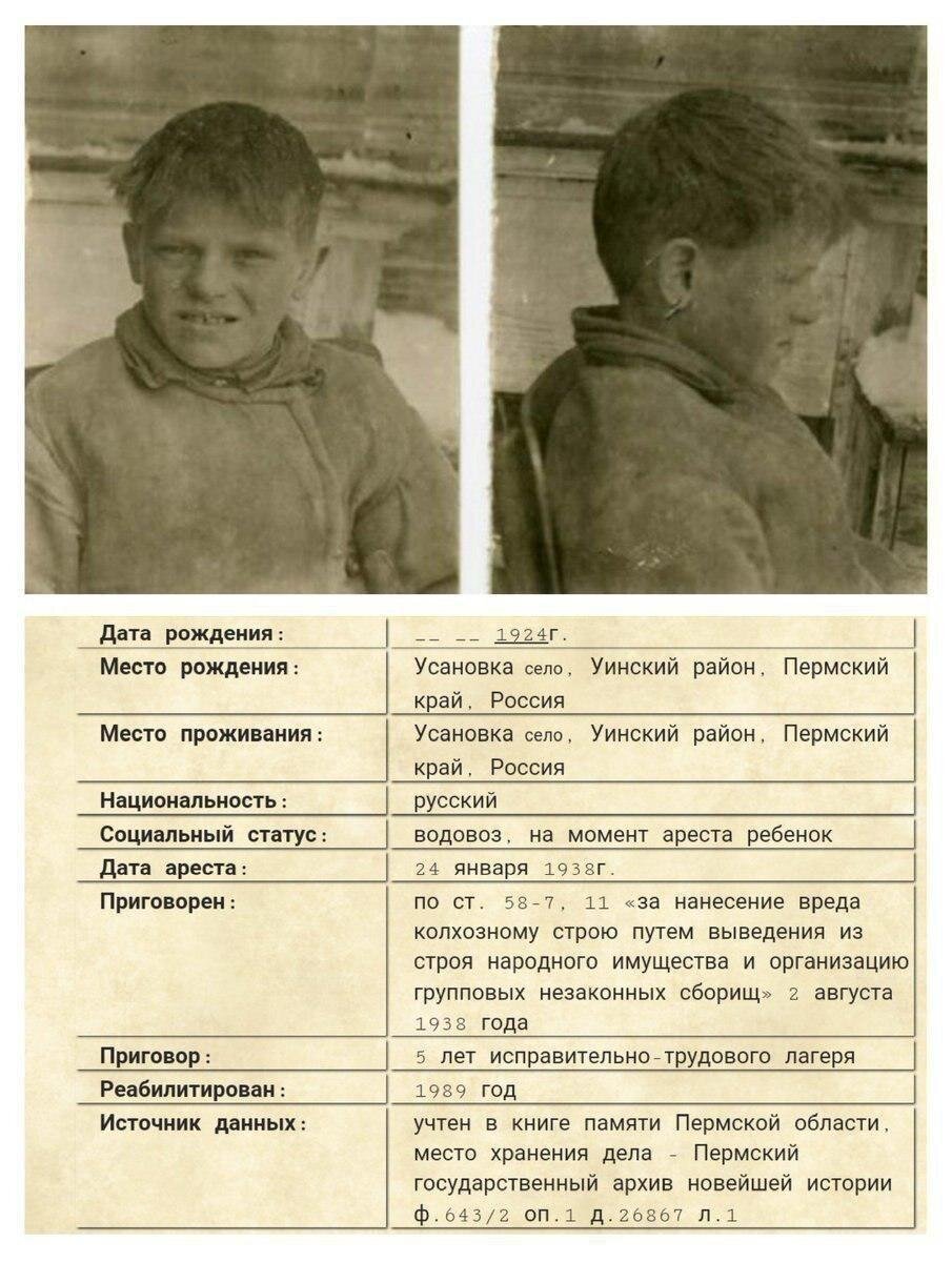 24.01.1938 Путилов Григорий Павлович в возрасте 14 лет был арестован за то что колесо от колхозной телеги, на которой он ездил, случайно свалилось в реку. Приговорен к 5 годам лишения свободы. В 1989 г. реабилитирован.
