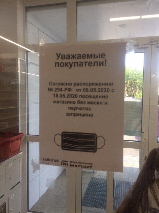 Многие регионы ужесточают режим самоизоляции, обязывают граждан носить маски и перчатки. Это правильно, беречься надо. Не всем ясно, есть ли польза от ношения этих масок, но указявки приняты к исполнению. Наш президент распоряжается, губернаторы берут под козырёк, а местные барчуки перегибают палку и начинают сочинять отсебятину. Тяжело охранникам в магазинах: неизвестно, как можно "не пущать" покупателя без маски, если покупатель буром прёт, а касаться его охранник не имеет права. Видно, для этого дефективные менеджеры из "Магнита" придумали ноу-хау. Понаразвесили ЭТО во всех своих магазинах: Привыкли "успешные предприниматели", что народ верит каждому печатному слову, что почти никто не проверяет ссылки на законы и нормативные акты. Поэтому и позволили себе написать неправду в объявлении. Нет такого распоряжения - №294-РФ от 08.05.2020. За таким номером - есть распоряжение, но оно от 18 марта, и оно об оформлении листков нетрудоспособности. О масках там речи нет. Мало того, что нав