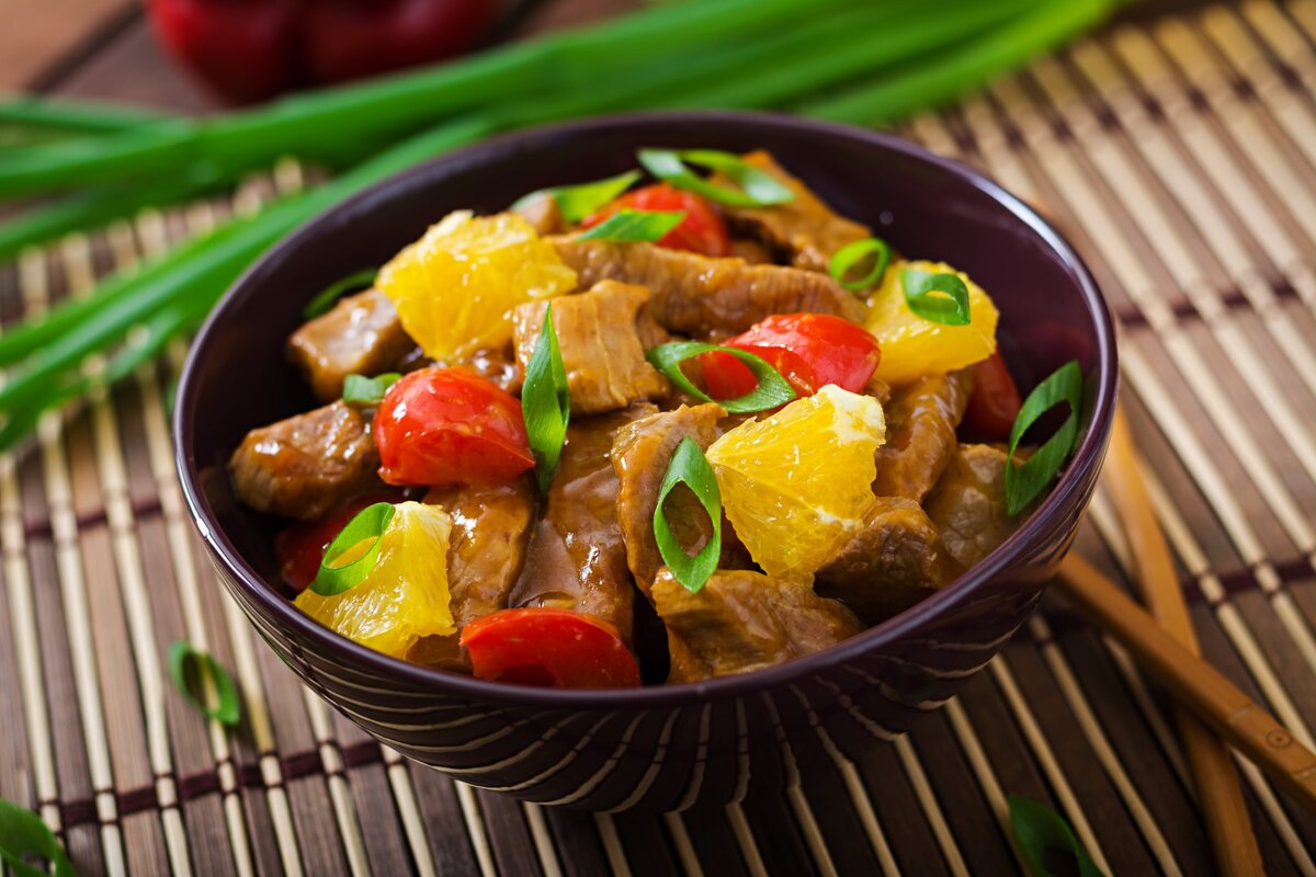 Возможно Вас заинтересуют следующие рецепты: Сливочная паста с индейкой Необычное рагу Свиная рулька в пиве Говядина "Веллингтон" Курица по-испански Для приготовления нам потребуется: Телятина - 500 г Болгарский перец - 2 шт Соевый соус - 2 столовых ложки Апельсины - 2 шт Зеленый лук - пучок Луковица - 1 шт Апельсиновый сок - 125 мл Апельсиновая цедра - 1 столовая ложка Растительное масло - 2 столовых ложки Тертый имбирь - 1 чайная ложка Кукурузный крахмал - щепотка Шаг 1. Мясо нарезаем тонкими полосками, выкладываем в отдельную посуду и поливаем соевым соусом. Тщательно перемешиваем. Шаг 2. Болгарский перец хорошо моем, удаляем семена, нарекаем кусочками. Шаг 3. Разогреваем сковороду на плите, добавляем 1 столовую ложку растительного масла и обжариваем болгарский перец в течение 5 минут хорошо помешивая. Шаг 4. Чистим луковицу, режем кубиками и обжариваем до золотистости. Шаг 5. Высыпаем к перцу. Шаг 6. Остальное растительное масло выливаем на сковороду, выкладываем телятину и обж