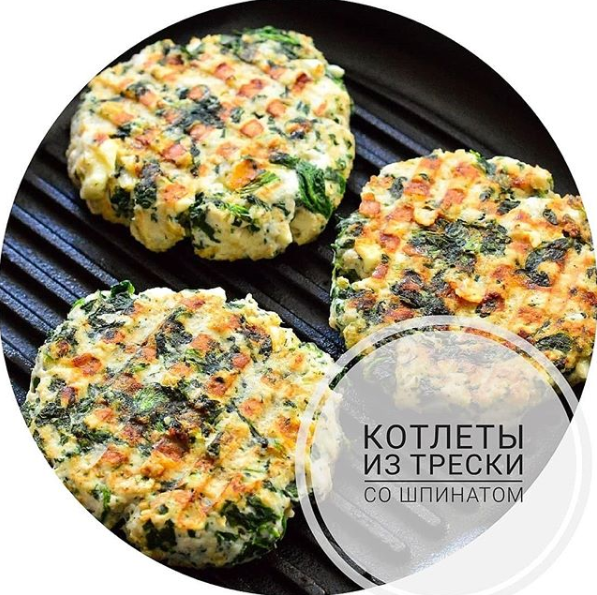 Состав: Шпинат 200 г Лук репчатый 1 штука Горчица 1 чайная ложка Яицо 1 штука Соль, перец по вкусу Масло для жарки 1 столовая ложка Филе трески 250 г (так же подойдёт хек) Сыр тертый 50 грамм Мука для панировки Приготовление: Пропустить через мясорубку рыбное филе. Обжарить на оливковом или топлёном масле и мелко порубленный лук до состояния прозрачности. Добавить соль, перец. К рыбному фаршу аккуратно подмешать яйцо, горчицу, лук, тертый сыр, порезанный шпинат. Тщательно перемешать и слепить котлеты. Обвалять котлеты в муке и жарить на среднем огне по 7-10 минут с каждой стороны. КБЖУ на 100 грамм: 156/11,4/11,3/2,7 Приятного аппетита!