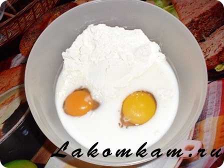 Десерт сливочные блинчики «Распутница». Приготовление. Яйца, сахар, муку, сливки, воду, соду выложить в глубокую посуду.