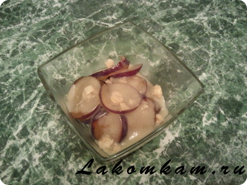 Десерт «Сливы в карамельном соусе». Ингредиенты: конфеты карамельные (со сгущенной начинкой) — 100 грамм; сливки — 70 грамм; сливы крупные — 8 штук.
