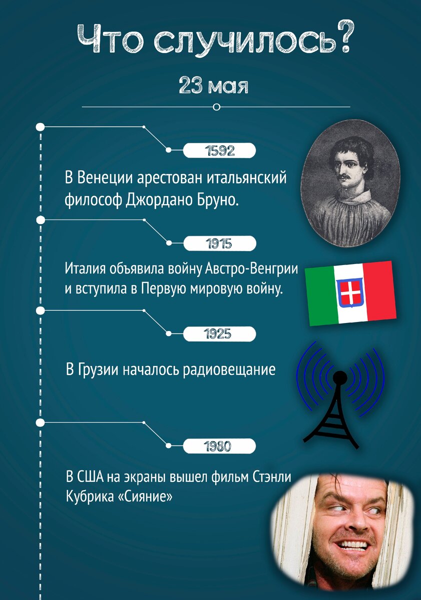 - 23 мая 1592 года Джордано Бруно был арестован и передан суду инквизиции. Ему были предъявлены такие обвинения как: богохульство, аморальное поведение и еретические взгляды. Бруно был приговорен с сожжению на костре, а его последними словами были: «Сжечь – не значит опровергнуть».