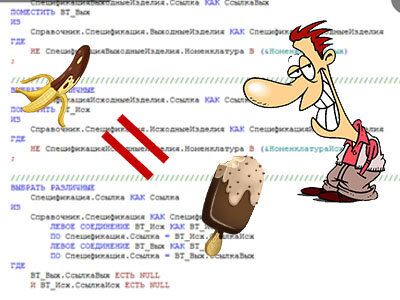 Доброго времени суток! Вчера читая всем известный форум 1сНиков, наткнулся на интересную задачу из собеседования, по крайней мере так писал автор. Об этом и хотел поделится. На первый взгляд элементарная задача загнала в тупик, но решение было найдено. Возможно не лучшее но на известном форуме лучше пока не кто не предложил. Суть задачи: Из справочника с двумя табличными частями выбрать записи полностью совпадающие с запрошенными с отбором по таблицам справочника. Конструкция такая (Справочник номенклатуры, Справочник спецификация) ищем в табличных частях спецификации полное совпадение Сначала все показалось просто и сходу было решение: Но вот не задача такой запрос не учитывал количество вхождений и на запрос: Вых: Н1, Н2 Исх: Н1, Н3 Выдавал две записи у которых структура заполнения была: Спец1 Вых: Н1, Н2 Исх: Н1, Н3 Спец3 Вых: Н1,Н2 Исх: Н1 Присутствовала всхожесть в список по минимуму, тут начался поиск решения. И единственное что пришло в голову нужно