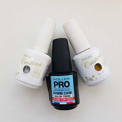 Сначала наносим базу и цветное покрытие. Сегодня мы выбрали нежно-желтый оттенок, полученный при смешении белого и желтого гель-лаков (Cristina 1323 и Cristina 1432).