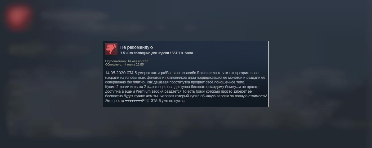 Недавно в Epic Games Store стартовала бесплатная раздача GTA 5, которая обрушила сначала сервера Epic, а затем и сервера Rockstar Games. Через некоторое время игру все же можно было добавить себе в библиотеку. Теперь же недовольные покупатели игры в Steam стали занижать GTA 5 рейтинг, жалуясь на то, что они потратили на нее деньги. В порыве гнева игроки не сдерживались в выражениях. И если недовольство игроков, купивших игру, а потом еще получивших ее бесплатно в другом магазине, понять сложно, то пользователям, которые жалуются на наплыв читеров, остается только посочувствовать. В GTA 5 с момента выхода онлайнового режима, как и во многих сетевых играх, есть определенные проблемы с нечестными игроками. Несмотря на эти негативные отзывы, положительных откликов все равно было оставлено гораздо больше. 15 мая появилось 459 отрицательных против 3088 положительных отзывов. Многие игроки все равно хвалят разработчиков и площадки за раздачу. Раздача GTA 5 в Epic Games Store продлится до 21