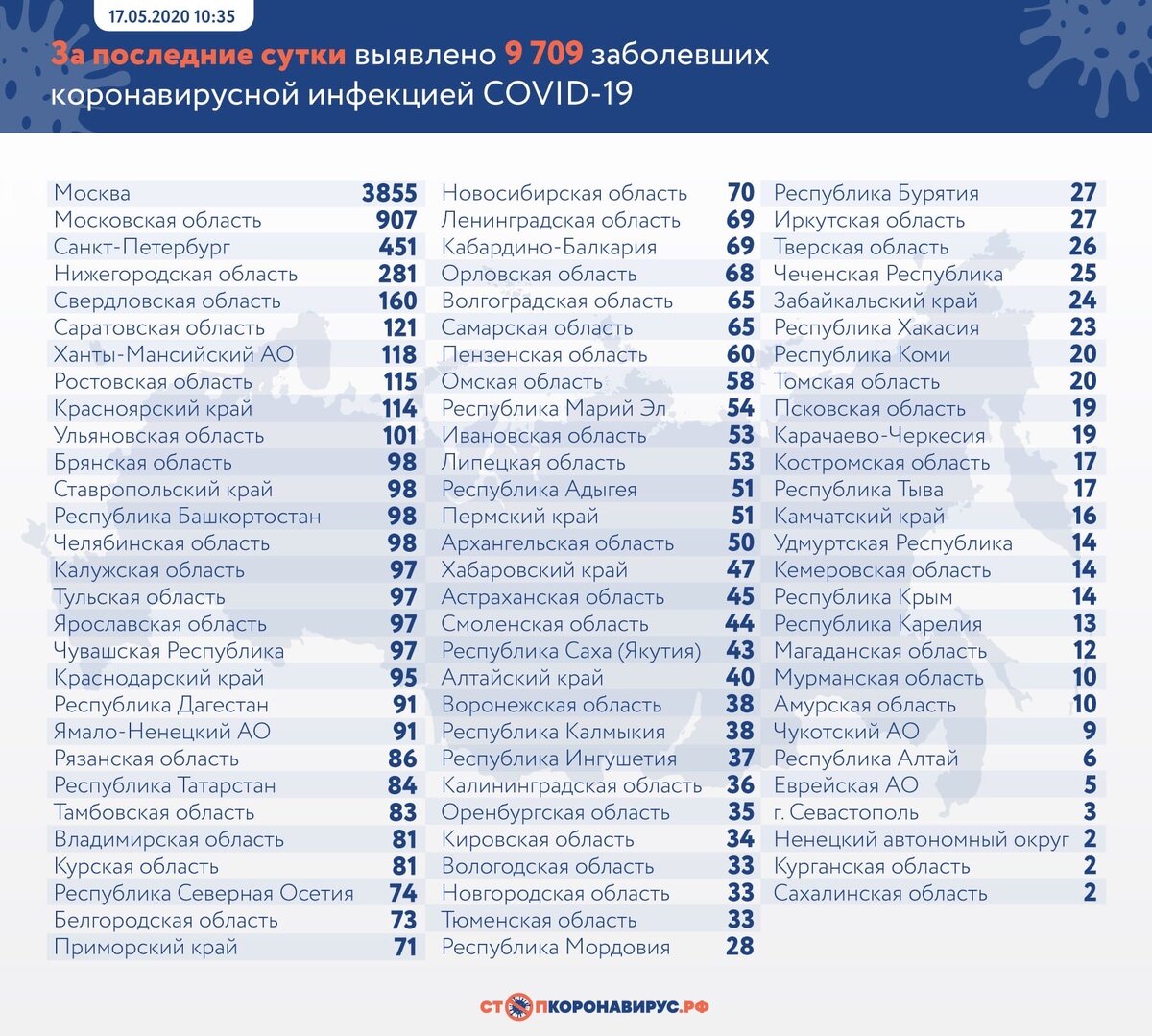 Всего в РОССИИ проведено тестов на коронавирус: 6 916 088 , из которых выявили 281 752 (+ 9 709 за последний день) случаев заражения, 67 373 вылечились и к сожалению скончалось 2 631 человек Лидеры по заражениям среди городов России: Успехов вам, друзья и здоровья! Постарайтесь не выходить из дома и чаще мойте руки! Подписывайтесь на канал👆 и на мои соцсети (ссылки в профиле)! И не забудьте поставить палец вверх - вам не сложно, а каналу это очень поможет!👍