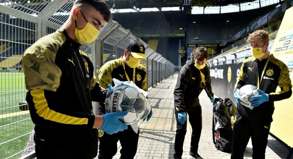Дортмундская "Боруссия" разгромила соперников "Шальке" со счетом 4: 0, а футболисты отпраздновали голы ударами локтей. Проверка температуры, несколько шин и дезинфицированные шарики Итак, как выглядел футбол в мае 2020 года. Команды прибыли в нескольких автобусах, чтобы игроки могли социально дистанцироваться на пути к игре. Игроки и персонал всю неделю находились на карантине в командных отелях и регулярно проверяются на наличие коронавируса. Выходя из автобусов, они надевали маски для маскировки лица и спускались на землю. Других людей, присутствовавшие на играх, включая средства массовой информации, проверили их температуру. Болельщикам было запрещено посещать матчи, а полиция патрулировала, чтобы убедиться, что на площадках не собирается толпа. Только 213 человек были допущены на стадион на поле и вокруг него (например, игроки, тренеры и мальчики с мячом) и 115 на трибунах (например, охрана, медики и СМИ). Еще 109 человек (включая охрану и операторов VAR) были допущены непо