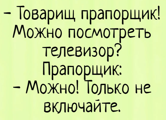 После фразы генерала «Подготовь дыру» прапорщик Иванов не понимал, будет ли он повышен в должности или будет ли еще наказание ... В столовой боец обращается к прапорщику, товарищ прапорщик мне мясо положено есть, прапор отвечает если положено то ешь. Солдат показывает тарелку где мясо нет и говорит, так оно же не положено. Ответ, если не положено то не ешьте товарищ солдат. Прапорщика спрашивают, как вы работаете, тяжело ли вам? Прапор отвечает, что я лошадь, чтобы работать. Значит вы служите? Собаки служат ответил прапорщик. А что вы тогда делаете? Я в ожидании войны, я же военный! Приобрел прапорщик в магазине электронные часы, повесил на руку идет по дороге смотрит на них. Подходит к нему девочка и говорит, дяденька скажите пожалуйста сколько сейчас времени. Прапорщик отвечает, 12 подели на 25 и узнаешь. Дяденька, а сколько это будет, отстань девочка, сам еще не разделил. Солдат подходит к прапорщику и говорит, товарищ прапорщик к тебе жена пришла. Что значит к тебе, ты как разгова