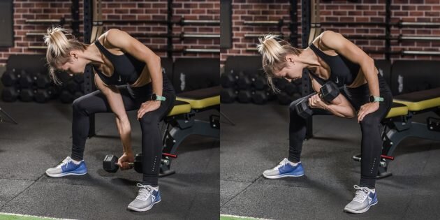 Возьмите в руки гантели, чуть согните колени и наклоните корпус вперёд с прямой спиной. Согните локти под прямым углом, держите их близко к телу. Разгибайте руки с гантелями и возвращайте в исходное положение.