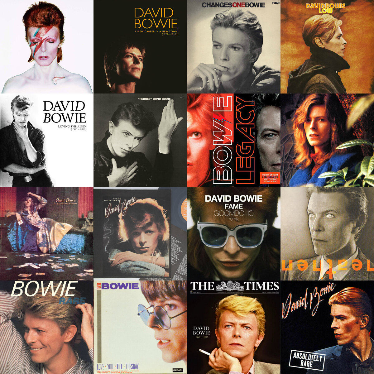 Музыкант, совершивший фурор на рок-сцене 70-х годов, написал и выпустил за всю свою карьеру более 30-ти музыкальных альбомов, множество песен из которых стали хитами во всем мире. Боуи был настоящим художником: так, как и сами альбомы, их обложки так же выполнены в уникальном стиле и имеют художественную ценность.