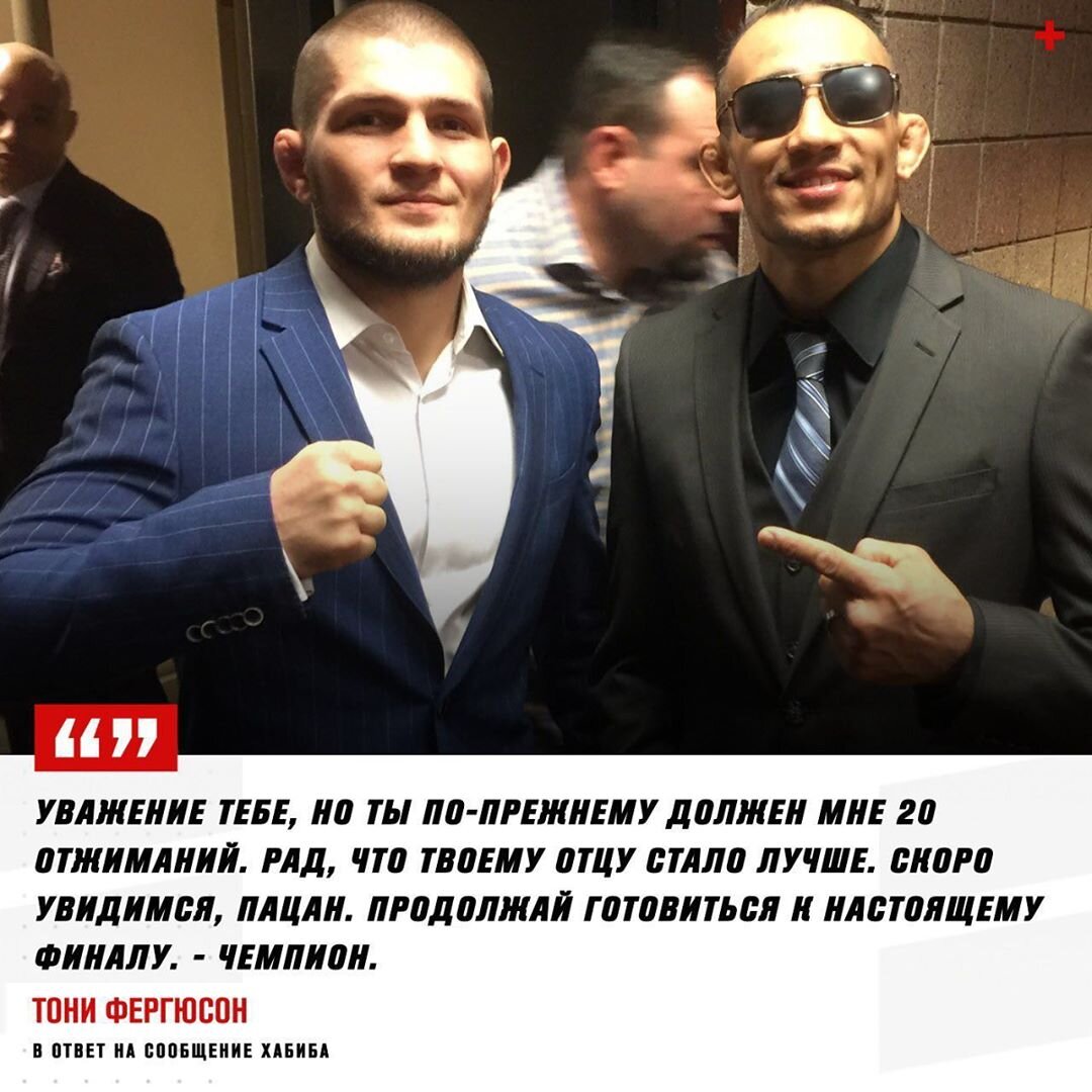 Проигравший свой бой на турнире UFC 249 американский боец Тони Фергюсон впервые прокомментировал у себя в личных соцсетях слова Хабиба Нурмагомедова. Россиянин поддержал Фергюсона, который уступил Стивену Гэтжи и теперь не сможет подраться с ним за чемпионский пояс в легком весе. В пятый раз подряд бой Хабиб Нурмагомедов - Тони Фергюсон был сорван. И последним шансом была бы победа Тони над Гэтжи, однако ему не покорилась эта вершина. И вот у себя в соцсетях Фергюсон написал ответ для Хабиба: - Уважение тебе. Но ты по-прежнему обязан мне 20 отжиманий, приятель! Я рад, что у тебя все становится лучше и лучше. Скоро увидимся, парень. Продолжай готовиться к настоящему финалу, чемпион, - написал у себя в Инстаграме Тони Фергюсон. Напомним, что бой Хабиба и Тони должен был пройти 18 апреля в Нью-Йорке на очередном "номерном" турнире UFC. Однако он был сорван из-за пандемии коронавируса. О чем лично вечером 1 апреля заявил Хабиб Нурмагомедов.