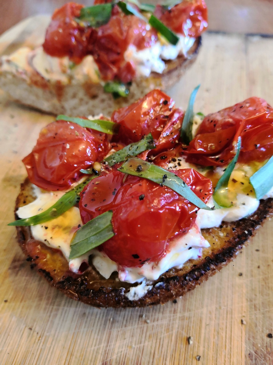 В прошлом посте была теория зельеварения. Мы сжижали дым, чтобы шашлыколомка не заставила тебя мангалить прямо в квартире, окрашивая потолки и стены в coal black 0d0908. Пришло время практики: брускетта с подкопченными томатами. Смотри: на этом масле чеснок, чили, томаты быстро обжариваем с солью и перцем. Зубчики чеснока не чистим, кладем нож плоской стороной на чеснок и ладонью уяк! Плоский. Чили просто режем вдоль, томаты прямо с веткой, потом снимешь. Осторожно с томатами, не на борщ зажарка, подрумянились и доставай. Чеснок достаешь из шелухи, мелко рубишь с чили. Мешаешь с творожным сыром или рикоттой. Туда же мелко крошишь петрушку, смазка готова. В сковороде у тебя еще осталось жидкое золото, поджарь на нем хлеб. Формула бутера: Булка/2+соус+помидор*8+зелень Тонкий аромат сладких подкопченных помидор смажет твою пустоту внутри, гарантирую.