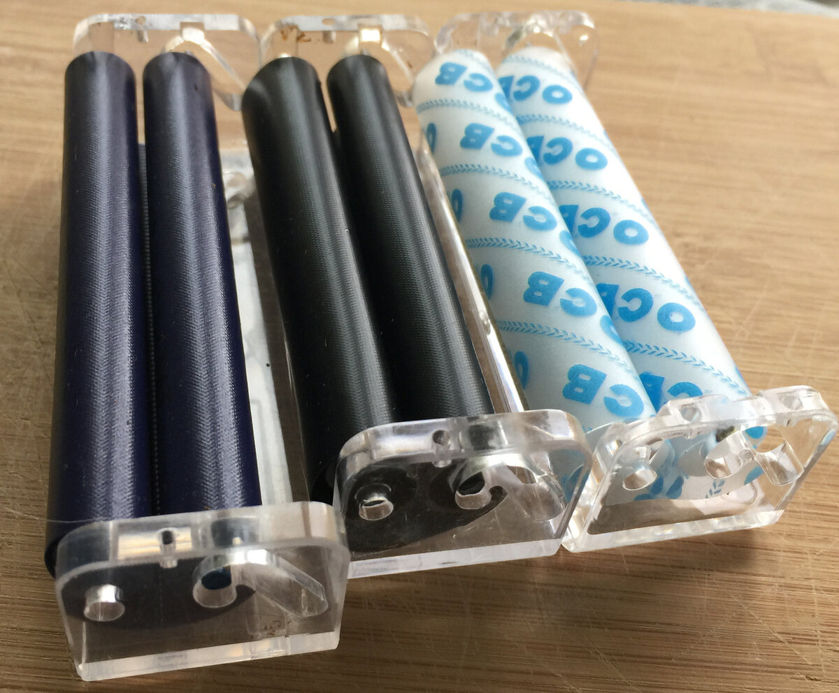 Машинки: Mascotte Classic Handroller 1 1/4 (для бумаги длиной около 78 мм), Gizeh Giro и безымянная OCB (обе для бумаги около 68 мм). Все машинки из пластика и с одинаковым принципом работы.