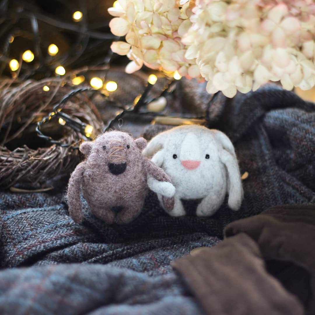 Вот по этой парочке сразу и не скажешь, что они выполнены в разных техниках. Мишка полностью свалян по-сухому, а вот у зайчика верхние лапки и ушки я сваляла по-мокрому.