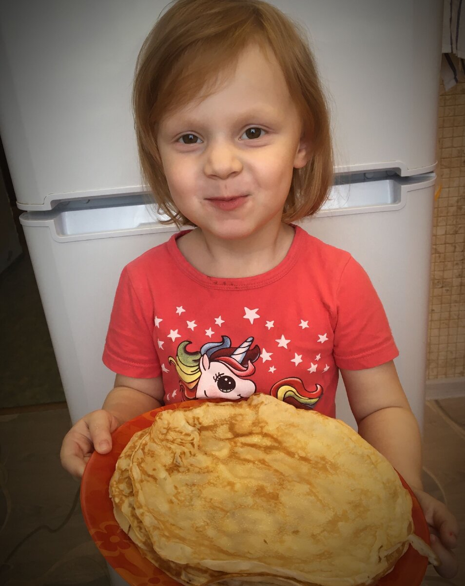 Мой любимы рецепт блинов. Проще простого, а на выходе очень вкусно. Особенно с пылу с жару со сливочным маслицем. Просто пальчики оближешь. ИНГРЕДИЕНТЫ. ПРИГОТОВЛЕНИЕ. 1. Яйца, сахар и соль взбить миксером. 2. Добавить молоко, муку и разрыхлитель и все перемешать. 3. Влить медленно при постоянном помешивании кипяток. 4. Добавить растительное масло и все хорошенько взбить. 5. Выпекаем на хорошо разогретой сковороде смазанной растительным маслом. Каждый блинчик я смазываю сливочным маслом. Еле успела сфотографировать дочка тарелку прям из рук вырвала))) Её любимые блинчики со сгущенкой.