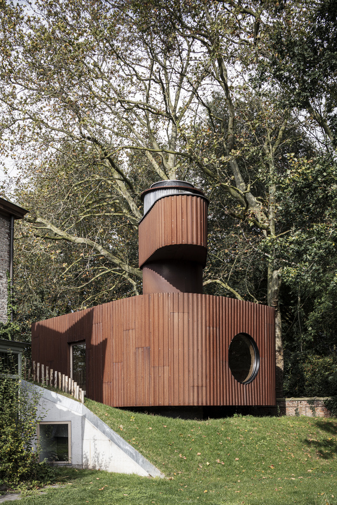 Гостевой дом от архитектурного бюро «Ателье Венс Ванбелле» в Бельгии Проект 150 кв. м построен в Бельгии в идиллическом месте в саду у реки Шельде. Владелец из киноиндустрии заказал дом для гостей, чтобы он запомнился им на всю жизнь. Посмотрим на прогулку по проекту снизу вверх. В небольшом доме есть кинозал с красными шторами и бар напротив него. И все это находится на подземном уровне на конце длинного подземного коридора. Вот уж сюрприз для посетителей. Кажется, бесконечная, винтовая лестница ведет будто в деревянную пещеру: вся отделка от потолка до пола выполнена из ламинированного дерева. Винтовая лестница заканчивается смотровой площадкой сверху. Тут можно принять душ под открытым небом и прикоснуться к кроне старых платанов. Вершина дома похожа на маяк. Для такого сложного вертикального зонирования была проведена ландшафтная работа: насыпан искусственный склон, скрывающий подземную часть. Зеленая крыша укрывает кинозал. На вершине склона просторная терраса с прекрасным
