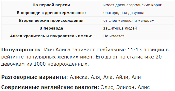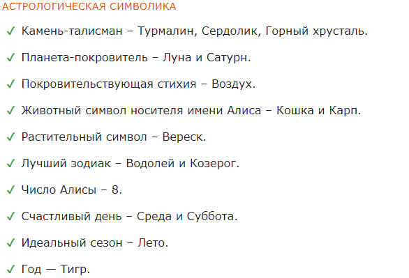 Женское имя Алиса, по главной версии, древнегерманского происхождения. Происходит от слова, означающего «благородная девушка». По второй версии, может быть одной из форм греческого имени Александра, имеющего трактовку «защитница человечества». Имеет положительную энергетику и наделяет носительниц имени Алиса такими важными чертами, как прямолинейность и честность, ответственность и справедливость, искренность и щедрость, бескорыстность и преданность. Алисы избегают общения с недоверчивыми, скрытными, корыстными и недобросовестными людьми. В свое окружение допускают только преданных, добрых, надежных и честных людей. СМОТРИТЕ ВИДЕО - ПОДРОБНЕЕ ТУТ Источник - Значение имени Алиса: карма, характер и судьба