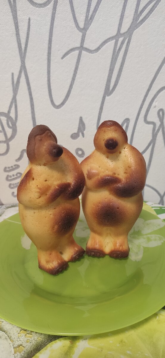 Зато они умеют стоять в тарелке. Купила я новую форму и решила побаловать своих мужичков кексами. Вот такие медведи должны были получится. Замесила я обычное тесто для кексов. Но я же хотела чтобы медведи мои были желтенькими, поэтому добавила кукурузной муки. Залила тесто в форму. Так как обычно заливаю форму на 2/3 наивно решила что тесто поднимется и и ушки заполнятся. Ну как говорится по форме первый блин комом, но по вкусу кексы получились наивкуснейшие. Подскажите как лучше пользоваться такими фигурными формами? Тесто поднялось по центру и все как один оказались безухие)))))). Зато устойчивые. Можно подавать к столу стоя в тарелке.