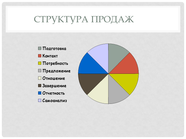 Что главное в активных продажах? Увеличивать количество согласий и уменьшать количество отказов! Иными словами увеличивать вероятность положительного завершения каждого контакта. Как это сделать? Предлагаю разложить процесс продаж на составляющие, разобрать каждый этап, увидеть зоны вашего роста на каждом этапе. Затем выбирайте наиболее понравившийся и со следующего клиента уделяйте внимание именно этому этапу. И с этого момента вы уже повышаете вероятность заключения сделки за счет развития ваших навыков продаж! Отработав выбранный этап переходите к следующему. Совершенству нет предела, вперед коллега! 1 этап. Подготовка Проваленная подготовка - подготовленный провал! На данном этапе необходимо собрать информацию о клиенте, подготовится к возможным возражениям, изучить продаваемый продукт, приготовить необходимые инструменты и конечно поставить цель. 2 этап. Контакт У вас никогда не будет второго шанса создать хорошее первое впечатление. Задача этого этапа установить контакт достато
