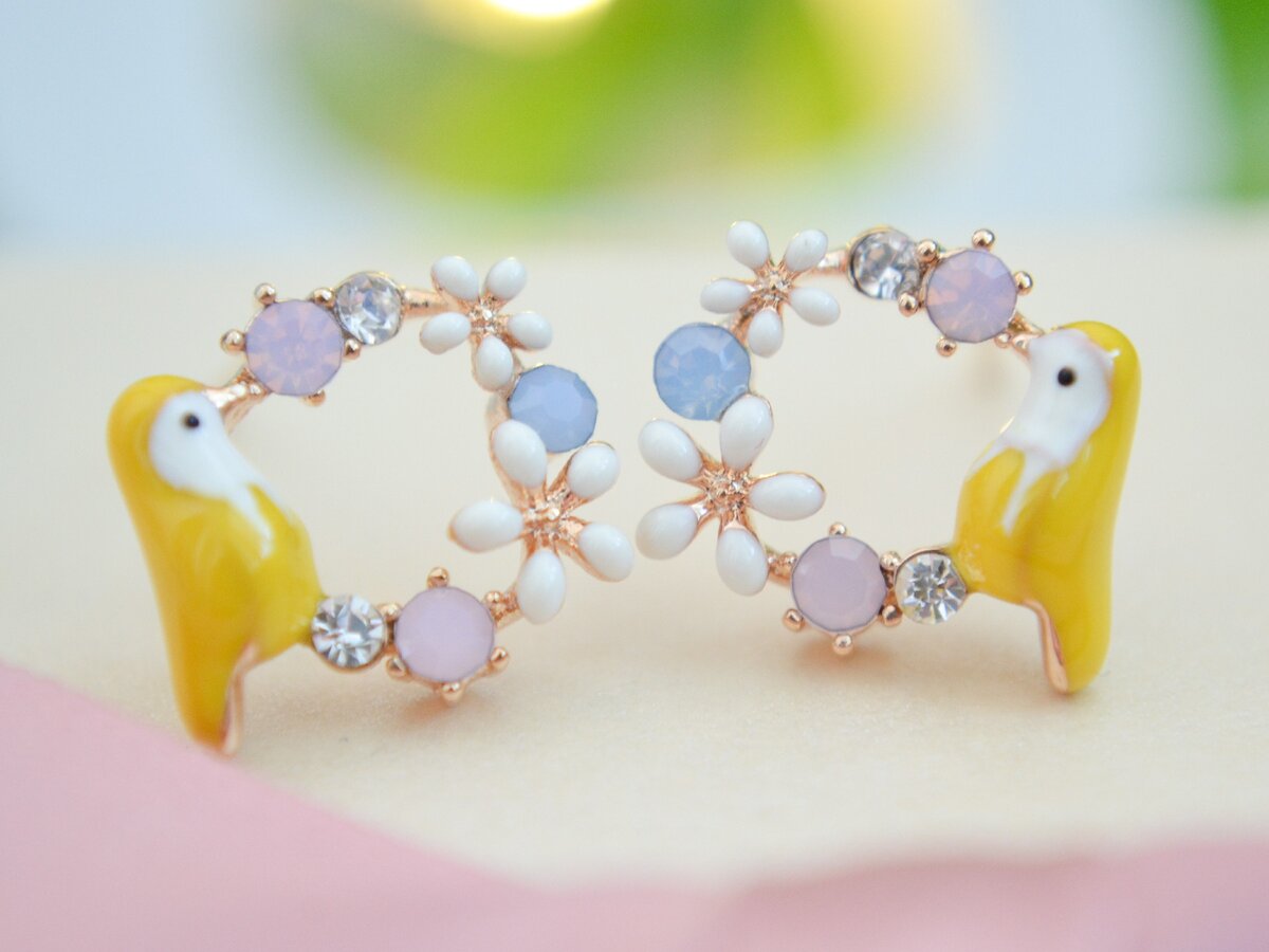 Замечательные серебряные серьги с весенним оформлением от магазина #HUDIESHUO Отличный вариант на каждый день! Миниатюрного размера в потрясающем оформлении! В желаниях 67 Заказов 21 Цена 2.76$ Размер примерно в диаметре 1см, может чуть более. Вес 2.7 грамма. Оформлены в виде веночка эмалированных цветов, цветных цирконов В основании красуется птичка покрытая эмалью желтого цвета. Больше похоже на попугая малюсенького, но указано голубь)) Тип серьги-гвоздики. Есть силиконовые заглушки Металл серебро, с покрытием под золото. Цвет золота реалистичный. Оттиск пробы непонятный, смазанный, но он есть на гвоздиках. Носила неделю. Никак не видоизменились, не потемнели. Аллергии не вызвали. Доставка в Беларусь отслеживаемым треком около месяца. Пришли просто в пупырчатом пакете. Без коробки ССЫЛКА
