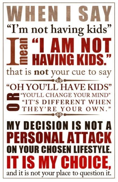 Кто-то не готов пожертвовать своим привычным образом жизни и сложившимся порядком. Это не эгоизм, это ответственный рациональный поступок. Какое бы счастье ни приносили дети, с их появлением в жизни родителя также появляется неконтролируемый хаос и оглушительное количество ограничений. Родитель долгое время, а, возможно, и никогда, не будет принадлежать себе: все свои решения и обстоятельства жизни, будь то покупка новой машины или смена места жительства, он должен согласовывать с потребностями ребенка. Именно должен, потому что ребенок не просил его рожать. Это ответственность родителей, которую они обязаны нести, по крайней мере, до его совершеннолетия. Страх стать плохим родителем также останавливает многих людей от деторождения. Ведь не существует четких и ясных критериев, описывающих, что есть «хорошая мать». Та, которая любит и помогает (в том числе финансово), поддерживает и направляет (здесь следует быть очень аккуратным), оберегает и заботится? А будет ли этого достаточно?