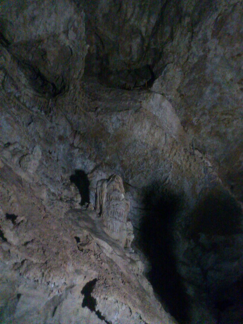Далее мы последовали в 4-й зал — "зал Аюха" (Москва), что в переводе с абхазского означает ущелье. Сухая часть пещеры начинается именно отсюда. Эту часть рассматривают как мертвую систему, поскольку вода в это русло не поступает. Зал Аюхаа уже и ниже, чем остальные залы. Потолок в основном имеет дугообразную форму. На стенах всевозможные выступы и углубления, сформировавшиеся под воздействием подземной реки, которая текла много лет назад. Это потолочные карры. Относительная влажность воздуха здесь составляет 60%. В этом зале вы не услышите ни шум водопада, ни журчание воды. Он является самой сухой частью всей пещеры. Не лишено это суровое ущелье и украшений. Самые привлекательные из них — величественные сталагмиты. Они сложены из полупрозрачного кальцита оранжевого и красного цвета. Сверху свисают небольшие сосульки. Это сталактиты. Навстречу им поднимаются сталагмиты. Для формирования сталактитов, сталагмитов и сталагнатов требуются тысячелетия. Один из таких сталагнатов я увидела