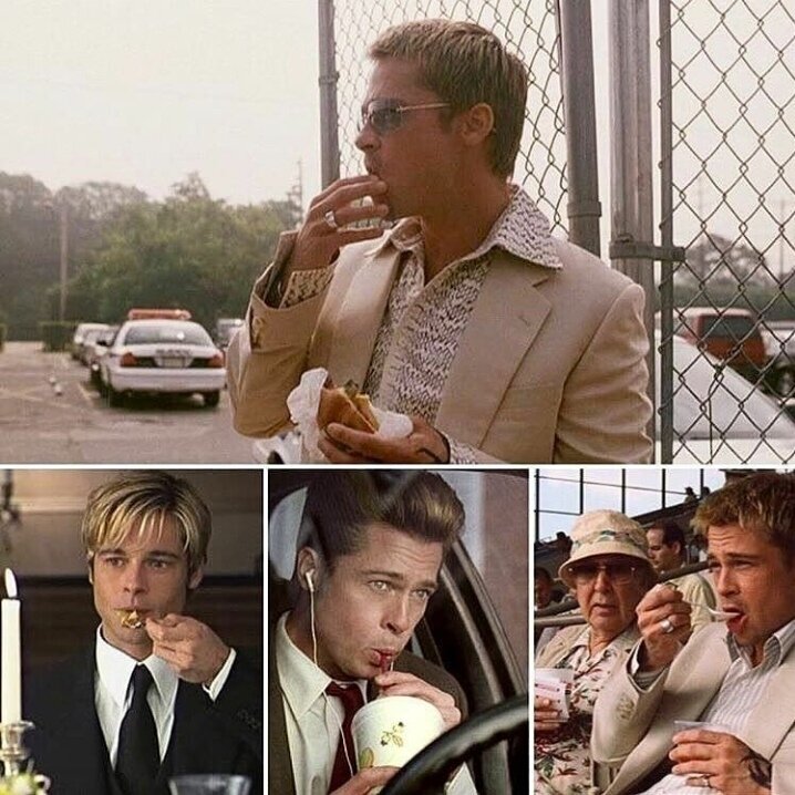 Каждый талантливый актер обладает своим уникальным стилем игры. Кто-то делает упор на мимике, жестикуляции и интонации. Кто-то отдает предпочтение определенным предметам гардероба, которые подчеркивают их актерскую игру. Кто-то и вовсе добавляет свои личные пристрастия в характер персонажа, тем самым сливаясь с ним. В общем, приемов целое множество. Порой даже именно эти актерские особенности и предопределяют выбор конкретного исполнителя роли. Предлагаем вам посмотреть, какие особенные фишки используют популярные актеры. Поехали! Довольно часто в фильмах с Брэдом Питтом можно увидеть сцену, где его герой что-нибудь с интересом уплетает. Еда стала определенной фишкой актера. Все началось с того, что Питт попросту не успевал перекусить между дублями, и ему порой приходилось как-то выкручиваться в кадре. Сцены с поеданием сочных бургеров, креветок или обычного сельдерея выходят у актера настолько органично, что эти кадры обязательно попадают в финальный монтаж картин с его участием. К