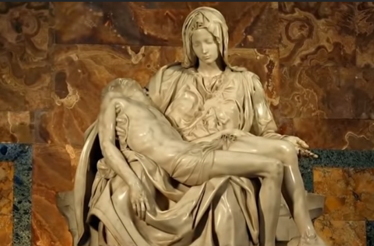 Лицо мадонны покрыто безмолвной болью. Это лицо очень молодой женщины. Микеланджело намеренно хотел подчеркнуть ее молодость, чтобы показать вечную жизнь. Богоматерь держит своего мертвого сына на коленях, как будто он все еще ее молодой, спящий ребенок.