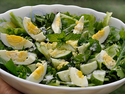 Вы наверняка знаете о пользе сельдерея, петрушки, рукколы, грецких орехов, чеснока, мяты – а именно эти ингредиенты входят в наш витаминный салатик! Поэтому сразу же перейдем к делу. Кстати, этот салат будет полезен и тем, кто на диете, если предложенную в нем сметану заменить на диетический обезжиренный йогурт. Ингредиенты: сельдерей – 2-3 стебля листья салата – полпучка руккола – 100 гр. свежий огурец – 1-2 штуки яйца – 2 шт. грецкие орехи-70 гр. Мята 2-3 веточки Чеснок-1 зубчик сметана или обезжиренный йогурт-150 мл. сок лимона по вкусу соль, перец по вкусу Приготовление: Яйца отварить до готовности. Залить холодной водой и дать остыть. Почистить . Листья салата порезать крупными кусками или порвать руками. Рукколу, если листочки крупные – тоже порвать , если мелкие – оставить как есть. Всю зелень сложить в большой салатник вместе с огурцами , перемешать и заправить соусом. Приготовление соуса для витаминного салата: возьмите блендер или ручную ступку . Измельчите в
