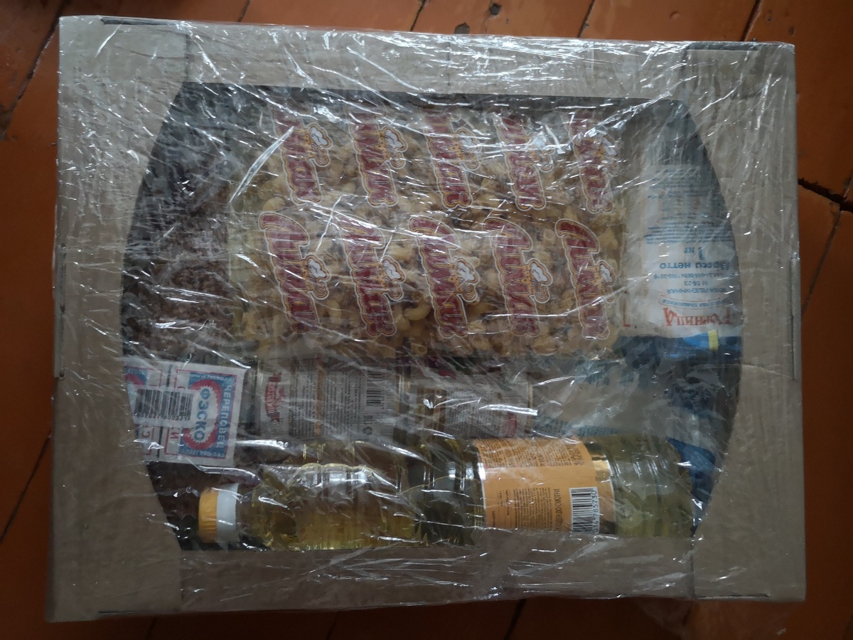 Моей маме - пенсионерке случайно и неожиданно перепал продуктовый набор. Живёт мама в небольшом городке Псковской области, в Великих Луках. Пошла как-то раз в магазин, а её перехватили какие-то парни в форме, спросили телефон, адрес. Через пару дней принесли коробку с продуктами. Вот такая коробка, перетянута полиэтиленом. Как я поняла, это не социальная служба, а просто какие-то добровольцы развозят продукты: на улице подходят к пенсионерам и берут данные, адрес, потому что на вопрос" А всем ли раздают?" сказали, что нет, только избранным. Форма охранников, какие-то беджики висели, но мама без очков не разглядела. Как вариант, воможно все таки это была соцслужба , чтобы народ не собирать у себя в помещении, решила таким образом раздать паек. Была и безумная версия, что у пенсионеров узнают адрес мошенники, чтобы потом ограбить. (Мошенников реально хватает, например, поменять электросчетчик за 15 тысяч предлагали как - то раз). В коробке оказались разные крупы (гречка, рис, гер