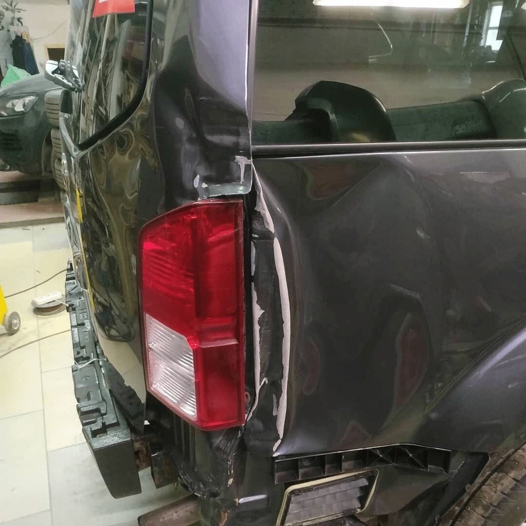 От ДТП на дорогах не застрахован никто. Вы можете быть самым прилежным водителем, но в один прекрасный момент вам в заднюю часть прилетит какой-нибудь "джигит" на гнилой "девятке". Именно такая неприятность и произошла с владельцем этого Nissan Pathfinder II, который получил удар в задний правый угол. Это привело к повреждениям заднего бампера, двери багажника и замятию крыла. Вот, посмотрите на повреждения. Вроде бы ничего серьезного, но... Дело в том, что с заменой передних крыльев проблем обычно нет. Достаточно открутить несколько болтов и снять поврежденную деталь. Задние же крылья в 99% случаев являются важное составляющей силовой структуры кузова, поэтому привариваются к каркасу. Поэтому при сильных повреждениях их нужно срезать, а затем вваривать новую деталь. Довольно сложная процедура, если честно. Поэтому многие механики прибегают к отвратительному способу. Они выправляют металл насколько это возможно, а затем накладывают толстенный слой шпаклевки. Причем вам об этом никто и