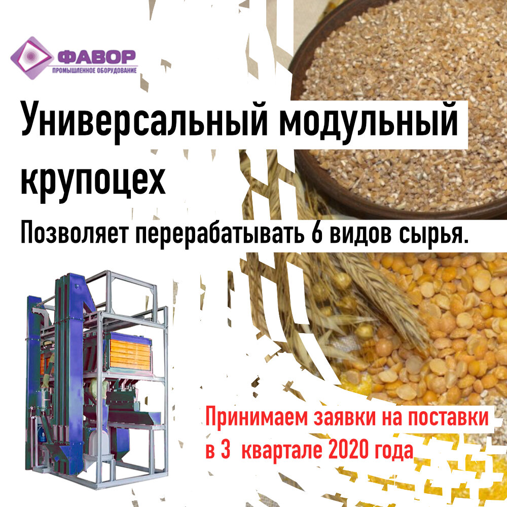 . Принимаем заявки на поставки в 3 квартале 2020 года Крупорушка универсальная КФУ-450 Сайт: http://kruporushka.favore.ru Универсальный крупоцех поставляется в полной заводской готовности, монтаж и демонтаж может быть осуществлен в течении 1 рабочего дня. Крупорушка смонтирована на общей раме с единым пультом управления, что позволяет максимально сократить сроки монтажа. Позволяет перерабатывать 6 видов сырья. Переход с переработки одного вида сырья на другой требует минимум времени (1-2 часа). Для установки крупорушки не требуется специальной подготовки помещения и обустройства фундамента. Обслуживание осуществляется всего 1 человеком. Есть вопросы – звоните +7 917 330 46 41