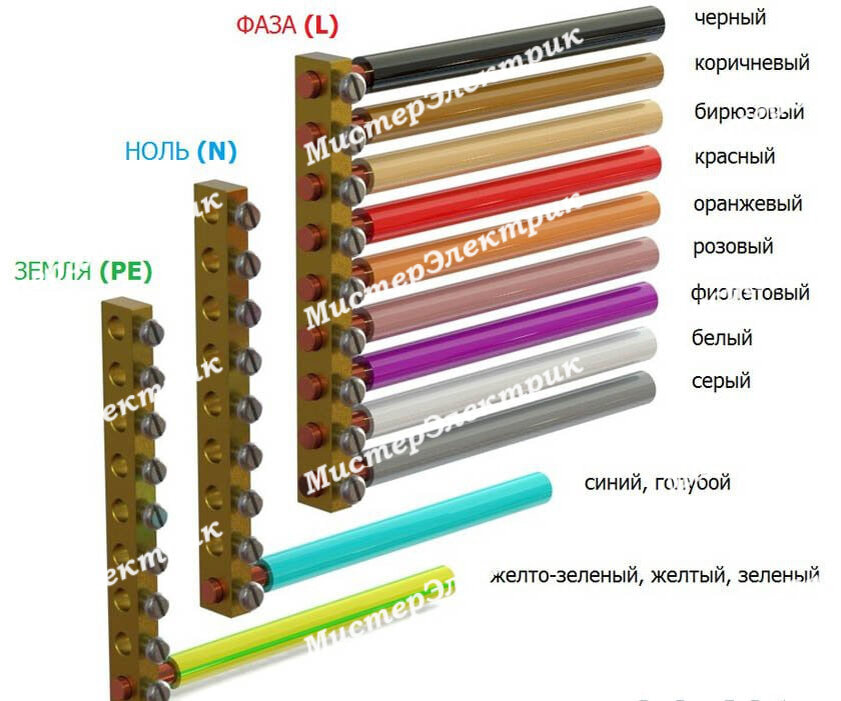 Фазные провода, в соответствии со стандартом ПУЭ, могут иметь маркировку одним из этих цветов: красный, черный, фиолетовый, коричневый, серый, розовый, оранжевый, бирюзовый, или белый.