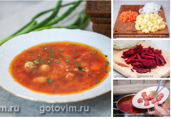 Отличительная черта сибирского борща - мясные фрикадельки (они же ёжики). Поэтому не удивляйтесь, если вам предложат «борщ с ёжиками». Вариантов приготовления сибирского борща множество. В этом борще есть еще и белая фасоль, что делает суп еще вкуснее. К готовому борщу подают сметану и свежую зелень. Для рецепта борща вам потребуется: для фрикаделек: мясной фарш (говяжий или свинина с говядиной) - 300г. соль, молотый черный перец, зелень - по вкусу яйцо - 1 шт. для бульона: картофель - 3 шт. репчатый лук - 1 /2 шт. морковь - 1 шт. (маленькая) свекла - 1 шт. капуста - 1/6 маленького кочана помидоры - 2 шт. фасоль (белая) - 2/3 стакана бальзамический уксус (или лимонный сок) - по вкусу чеснок - 1 зубчик соль, свежая зелень - по вкусу масло растительное для жарки. Шаг 01 Фасоль промыть, залить водой на ночь. На следующий день промыть, залить свежей холодной водой и варить до готовности в отдельной посуде. В конце варки посолить. Овощи вымыть, почистить. Лук, морковь, лук порезать кубик