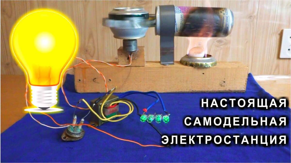 Домашняя экспериментальная Энергетическая установка способная выдать ток достаточный для свечения четырёх светодиодов, собрана на куску бревна из пустых алюминиевых банок. Первые пробы и испытания показали её эффективность на приборе , но приборы приборами, а вот запустить в нагрузку лампочку или хотя бы светодиод - вот это уже результат. Для достижения цели я испытал несколько типов генераторов из разных электромоторов и разные варианты паровых турбин. Не все варианты годятся в дело, так что проб и ошибок было не мало.