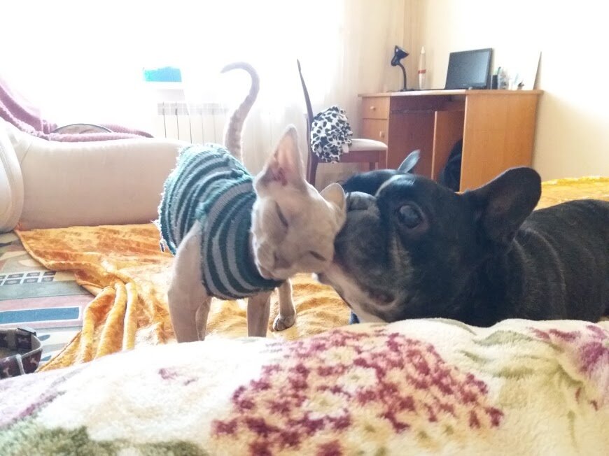 Прислали нам заявку на французского бульдога Гранта, мы всё посмотрели, изучили, обрадовались, согласились. Через несколько просмотров запроса случайно заметили, что гость не один, а с подружкой - кошкой Сафари, которая является канадским сфинксом. Я всегда мечтала погладить, потрогать эту экзотическую кошку и вот она возможность!