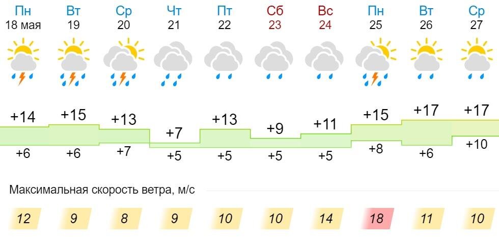 С 18 по 24 мая Кировскую область не покинут дожди. Наступившая неделя пришла в Кировскую область не просто с обильными осадками, но и частыми грозами. 18, 19 и 20 мая синоптики прогнозируют жителям региона грозы, которые будут сопровождаться достаточно теплой погодой. Температурный режим в эти дни будет колебаться в диапазоне от +13°C до +15°C в дневное время. Далее, до конца недели, будут идти обычные дожди, а температура понизится до +7°C. Самым холодным днем станет четверг. В субботу – чуть теплее (до +9°C). При этом осадки не будут сопровождаться порывами ветра. Его поведение обещает быть достаточно ровным, а скорость составит от 8 м/с до 14 м/с. Причем своего максимума он достигнет в воскресенье, когда дождь будет легким.