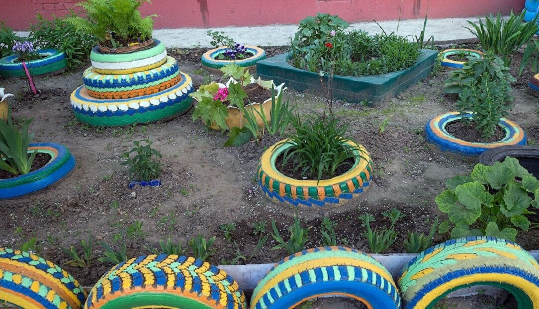 Самый дешевый и популярный вариант среди садоводов. Автомобильные покрышки тщательно промывают и укладывают в первичном виде на участке. Красят в нужный цвет. Заполняют плодородной почвой и сажают цветы. Также можно из покрышек изготовить фигуры или вазоны, которые засаживают цветами. Используя автомобильные покрышки, вы не только украшаете участок, но и заботитесь об экологии (будет меньше мусора свалках).