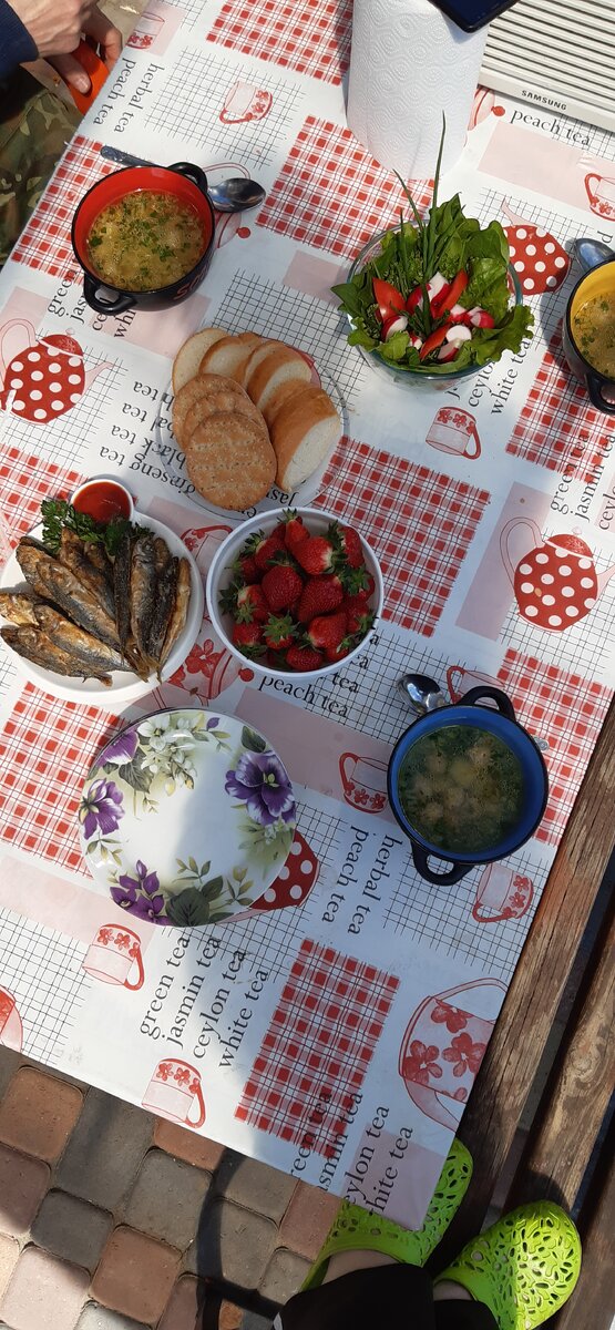 "Тёплой весной в радость накрыть обед во дворе на потрескавшемся столе, и не спеша трапезничать, наслаждаясь лучами солнца и звонким щебетаньем воробьёв",-подумала я и пошла накрывать на стол. Мама раздобыла на рынке ставридку и мы пожарили её на сковороде. Кстати, в отличие от мойвы, запаха при жарке ставридки практически нет. А сама рыбка вкусная и поедается со скоростью семечек Открытие месяца- пшеничные хлебцы Wasa с очень хорошим составом, сами не солёные, но присыпаны крупной морской солью. Папа сказал, что вкус как в советском прошлом Гора салата и овощей для хорошего пищеварения- всё, кроме помидора, своё, с грядки Обед без первого блюда обедом не считается. Поэтому на первое суп с куриными фрикадельками. И главное блюдо стола, очень сладкая и ароматная клубничка : А с такой картинкой перед глазами аппетит увеличивается в разы До новых теплых встреч, друзья!
