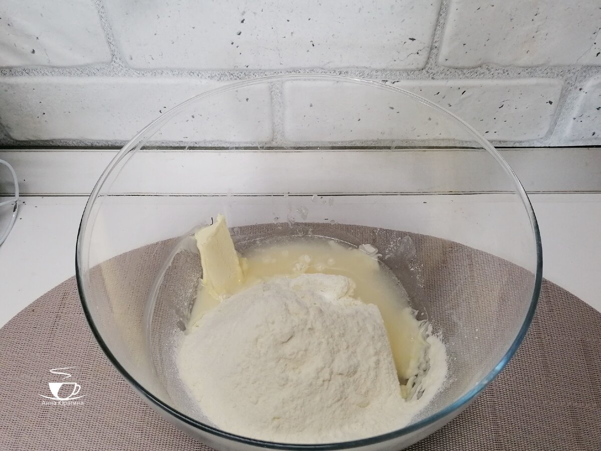 Первым делом нужно приготовить тесто. Для этого в глубокой миске смешиваем сразу три ингредиента :муку, воду, размяченное сливочное масло. И замешиваем тесто.
