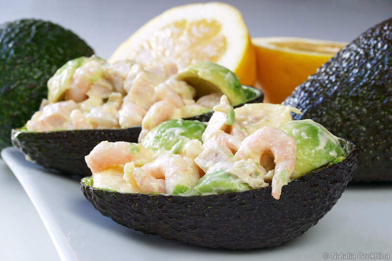 - 4 помидора ,30 варено-мороженных креветок,1 авокадо, 150 г сливочного сыра ,1 зубчик чеснока, 1 ст. л. лимонного сока,соль по вкусу.