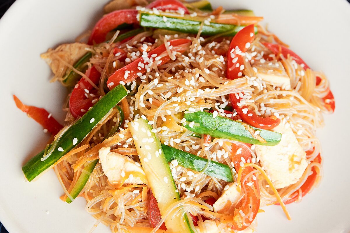 - К овощам добавляем курицу, фунчезу, огурец и поливаем соевым соусом. Перчим и добавляем паприку. Всё хорошо перемещать. По вкусу если не хватит соли, дополнительно приправьте соусом или просто посолите.