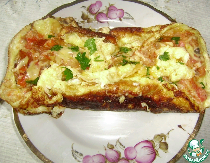 Рецепт «Яичница "Царская"»: Хлеб порезать пополам и поджарить на растительном масле с двух сторон. Отложить пока. Готовим соус. Помидоры обдать кипятком, снять с них кожуру и нарезать кусочками. Лук, чеснок и сало мелко порезать На сковороду положить сало, вытопить жир. Затем добавить лук с чесноком, жарить до золотистого цвета. Потом положить помидоры и тушить 10 минут, до кремообразного состояния. Соус также пока отложить. Яйца взбить с молоком, добавить соль и перец. В большой сковороде разогреть растительное масло и вылить туда яйца. Дать им хорошо схватиться. Теперь собираем всю нашу яичницу. В центр рядком выложить гренки (у меня ушло 3 кусочка), на гренки положить соус и сверху присыпать тертым сыром. Как яичница хорошо схватится, пытаемся сделать рулет. Свободными краями яичницы накрываем хлеб с соусом. Накрыть крышкой и тушить 3-5 минут. Яичница готова! Godzzilla.ru