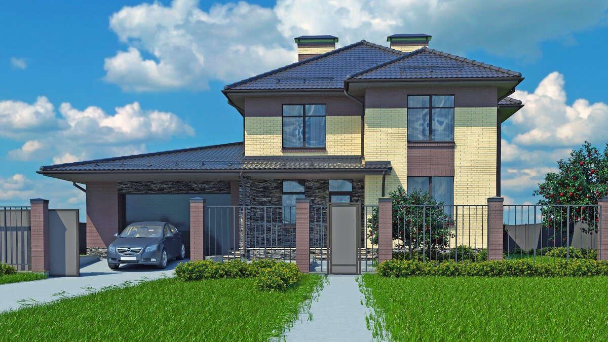 Впечатляющий 2-х этажный 220 м2 дом с гаражом и стильным желто-коричневым фасадом