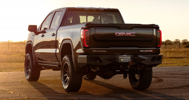 Безумный Hennessey Goliath 700 Supercharged на основе GMC Sierra анонсирован несколько месяцев назад, а теперь стартовало его производство. Тюнинг-кит HPE700 Supercharged с 2,9-литровым компрессором поднимает отдачу мотора V8 6.2 с 426 л. с. и 624 Нˑм до 715 «лошадей» и 915 Нˑм. В результате разгон до 60 миль в час (97 км/ч) занимает всего 4,3 секунды. Стоимость набора – 26 950 долларов. Передний бампер обойдётся в 18 950 долларов, выпускная система из нержавейки – в $2 750, тормоза Brembo – в $7 950. В пакет HPE Stage-1 за $14 950 входят приподнятая на 152 мм подвеска, новые колёса и обвес. Общая стоимость доработок – $74 850 при минимальной цене стокового пикапа с двигателем 6,2 литра в $52 090. Тираж – всего 100 штук. Также тюнеры готовы форсировать более скромный 5,3-литровый V8 до 507 л. с., а мотор V8 6.2 можно «разозлить» до 811 л. с. путём увеличения хода поршня.