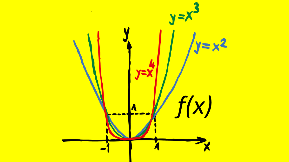 График функции, где n — чётное число (2,4,6,8...), принимает вид параболы.