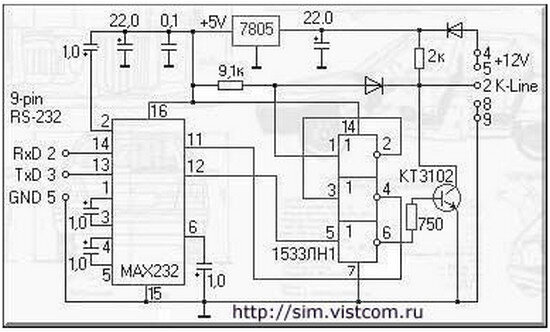 У некоторых ноутбуков СОМ-порт работает с уровнями сигналов +/- 3V, а адаптеры собранные на микросхеме МАХ232 выдают полноценные +/- 12V. Чтобы не было проблем с подключением K-line адаптера к ноутбуку нужно строить на микросхеме МАХ3232, которая имеет пониженные напряжения сигналов. Либо использовать микросхему DS275, которая работает с теми уровнями сигналов, которые получает. Таким образом, адаптер будет работать как СОМ-портом ПК, так и ноутбука. Кроме всего прочего, второй вариант практически не требует «обвязки» микросхем.